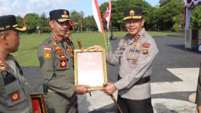 Kegiatan pun dilanjutkan dengan pemberian penghargaan kepada Kasatpol PP kabupaten yang berprestasi selama tahun 2022 dan diakhiri dengan foto bersama di lapangan Puputan Niti Mandala Renon.
