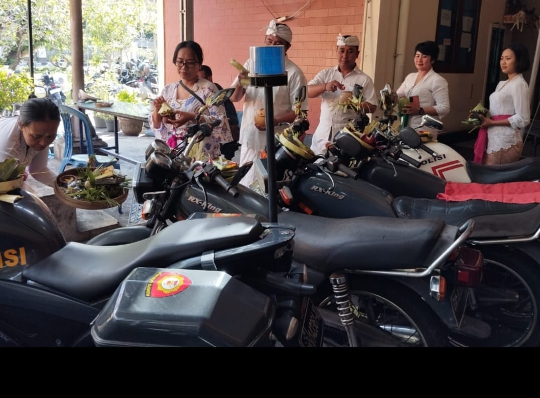 Polres Bandara, Balijani.id ~ Bertepatan dengan Hari Purnama Sadha yang juga perayaan Hari Tumpek Landep, seluruh barang inventaris Polres Kawasan Bandara I Gusti Ngurah Rai yang meliputi kendaraan dinas baik itu sepeda motor, mobil dinas dan sepeda gayung bahkan senjata api dinas juga turut di upacarai yang dipimpin oleh seorang pemangku, sabtu (3/6/2023).