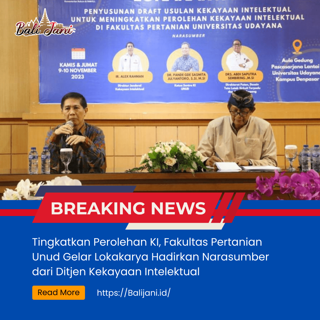 Denpasar, Balijani.id – Lokakarya Penyusunan Draft Usulan Kekayaan Intelektual Untuk Meningkatkan Perolehan Kekayaan Intelektual di Fakultas Pertanian Universitas Udayana (Unud) dilaksanakan di Ruang Aula Gedung Pascasarjana Kampus Sudirman Denpasar, Kamis (9/11/2023). Lokakarya yang dibuka langsung Dekan Fakultas Pertanian ini dihadiri oleh para Wakil Dekan, Para Koordinator Program Studi, UP3M dan UPIKS Fakultas Pertanian, serta Dosen dan Mahasiswa. Lokakarya yang berlangsung selama dua hari ini menghadirkan tiga narasumber yakni Ir. Alex Rahman dan Drs. Abdi Saputra Sembiring, M.Si dari Direktorat Jenderal Kekayaan Intelektual serta Dr. Pande Gde Sasmita Julyantoro, S.Si.,M.Si Ketua Sentra KI Universitas Udayana.