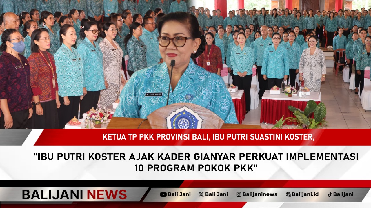 Gianyar, Balijani.id| Ketua TP PKK Provinsi Bali, Ibu Putri Suastini Koster, mensosialisasikan 10 Program Pokok PKK kepada kader TP PKK tingkat kecamatan serta desa/kelurahan di Kabupaten Gianyar. Sosialisasi yang berlangsung di Balai Budaya Gianyar, Selasa (26/8/2025), bertujuan mendorong akselerasi gerakan TP PKK, khususnya di Kabupaten Gianyar.