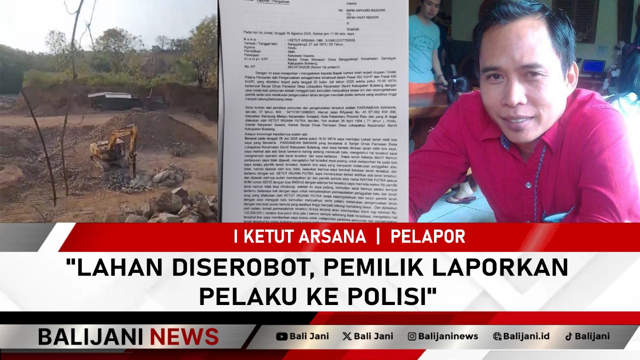 Buleleng, Balijani.id| Pemilik lahan berlokasi di Banjar Dinas Pamesan Desa Lokapaksa Kecamatan Seririt, Kabupaten Buleleng, melaporkan kasus dugaan penyerobotan lahan ke Polres Buleleng. Lahan tersebut diduga diserobot oleh Ketut Wijana Putra (71) warga Banjar Dinas Pamesan Desa Lokapaksa. Isi lahan berupa tanah dan bebatuan di ekspolitasi kemudian diperjual belikan oleh pelaku.