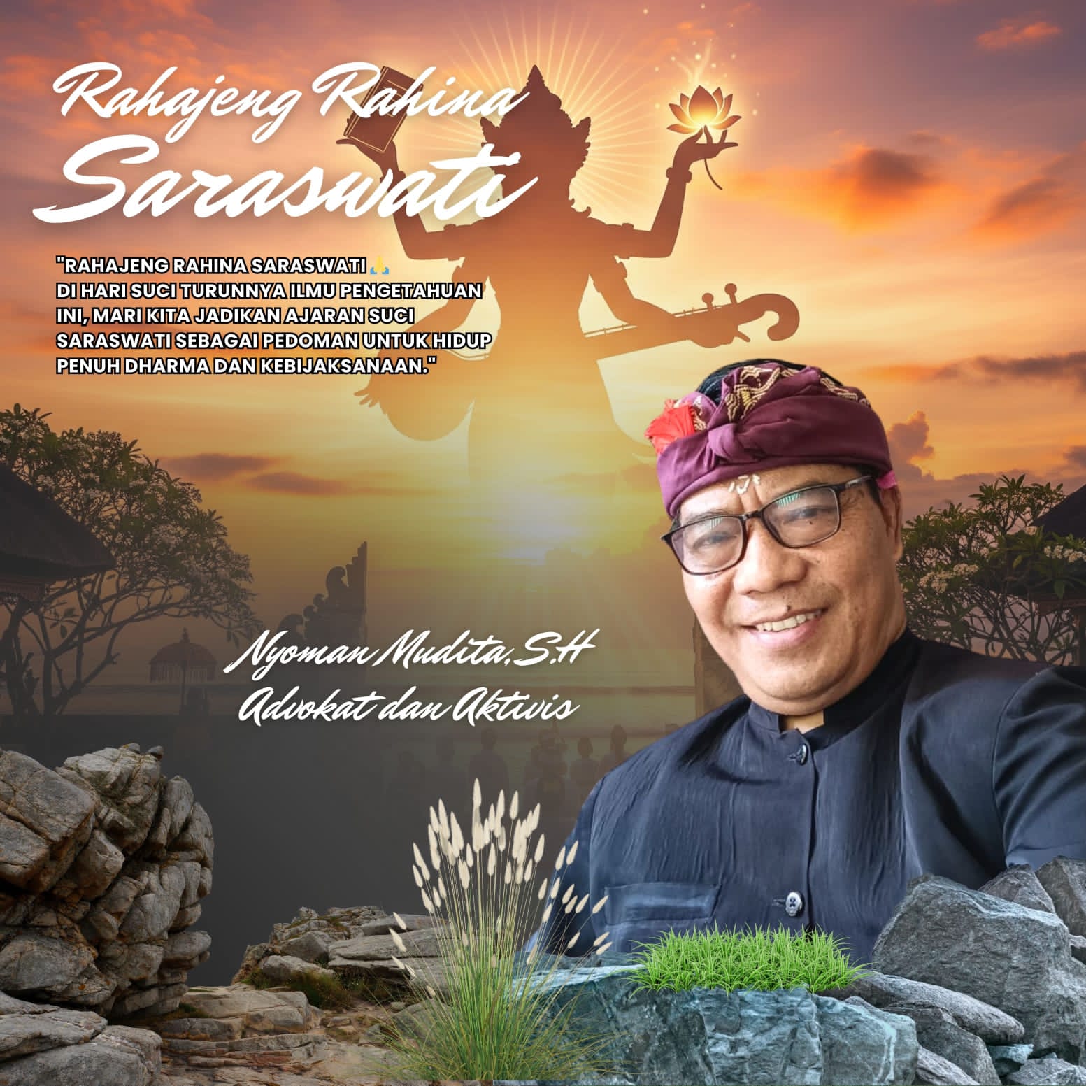 Nyoman Mudita Advokat dan Aktivis Mengucapkan Rahajeng Rahine Saraswati,di hari suci turunnya ilmu pengetahuan ini, mari kita jadikan ajaran suci saraswati sebagai pedoman hidup penuh dharma dan kebijaksanaan