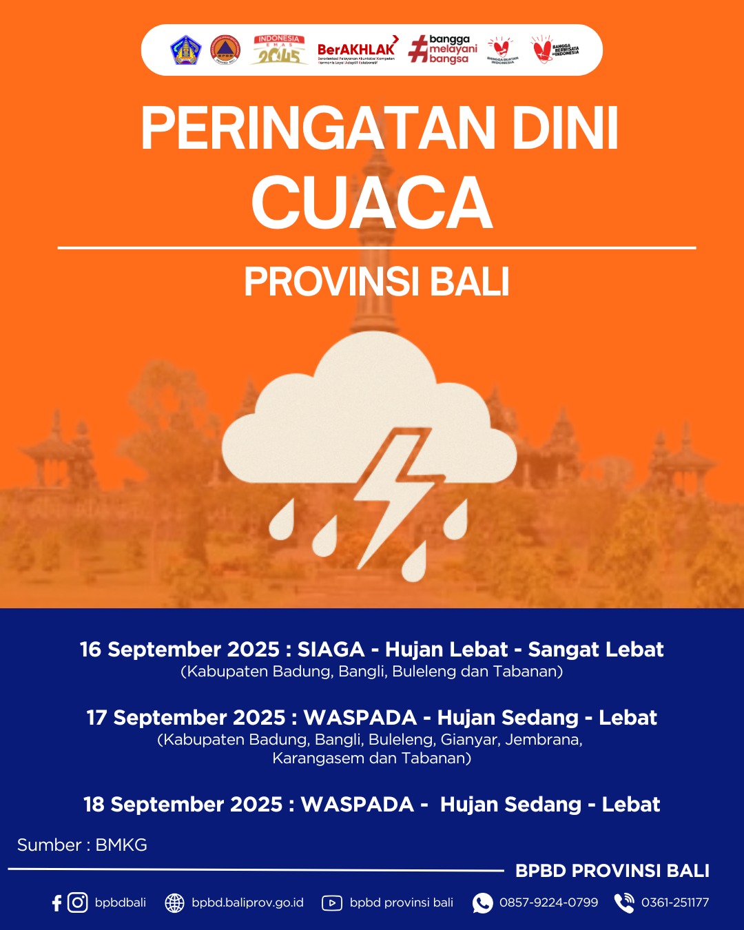 16 September 2025: Status Siaga hujan lebat hingga sangat lebat di Kabupaten Badung, Bangli, Buleleng, dan Tabanan.