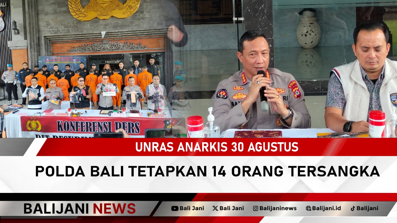 Konfrensi Pers selasa 16 september 2025 didepan para awak media Kapolda didampingi Dirreskrimum, Dirreskrimsus, Dirressiber, Kabid Humas, Kabid Propam dan Kabidlabfor Polda Bali, menyampaikan sesuai hasil penyidikan, pemeriksaan 24 orang saksi, termasuk rekaman CCTV di seputaran TKP dan barang bukti yang ada Polda Bali menetapkan 14 orang tersangka diantaranya 10 orang dewasa dan 4 orang anak-anak.