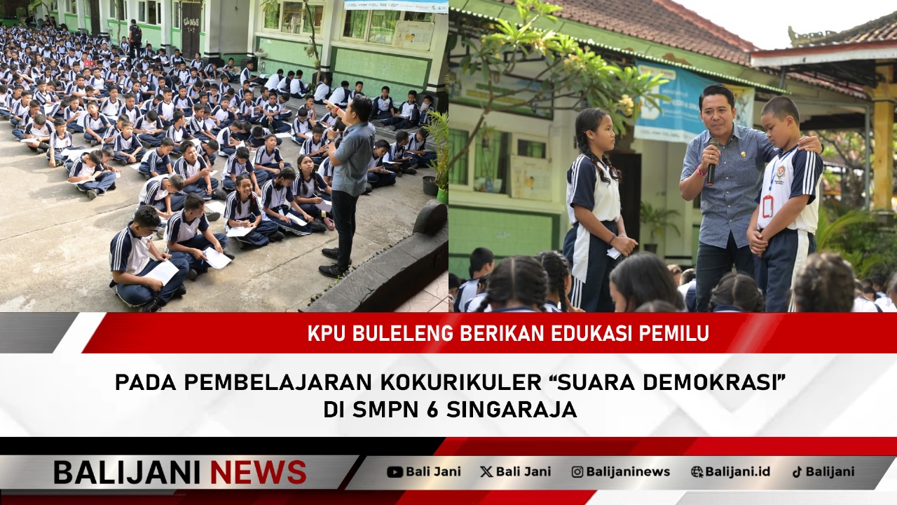 Singaraja, Balijani.id| Komisi Pemilihan Umum (KPU) Kabupaten Buleleng melalui Ketua Divisi Sosialisasi, Pendidikan Pemilih, Partisipasi Masyarakat, dan SDM, Putu Arya Suarnata, menjadi narasumber dalam kegiatan pembelajaran kokurikuler bertajuk Suara Demokrasi di SMP Negeri 6 Singaraja pada Sabtu (4/10/2025).