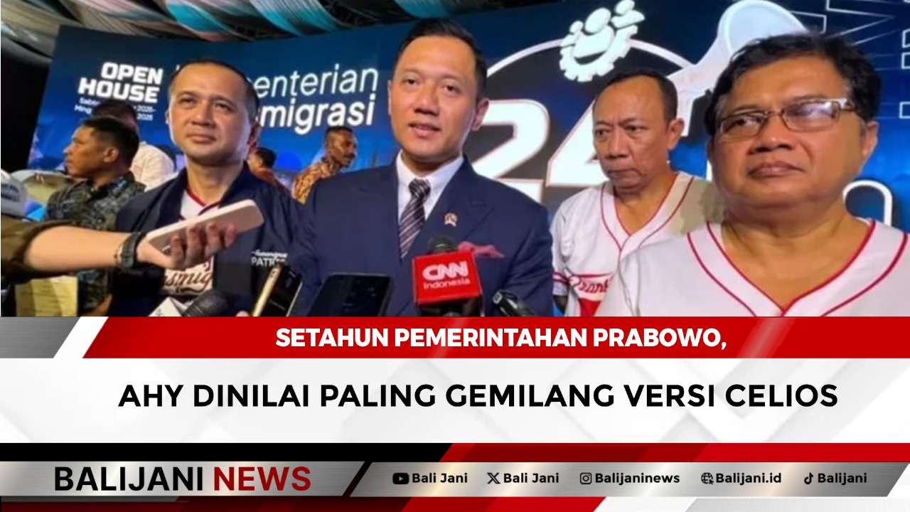 Jakarta, Balijani.id|™Memasuki satu tahun pemerintahan Presiden Prabowo Subianto dan Wakil Presiden Gibran Rakabuming Raka, lembaga riset Center of Economic and Law Studies (Celios) merilis hasil evaluasi kinerja kabinet. Hasilnya, Menteri Koordinator Bidang Infrastruktur dan Pembangunan Kewilayahan, Agus Harimurti Yudhoyono (AHY), dinilai sebagai menteri terbaik versi penilaian ahli dan publik.