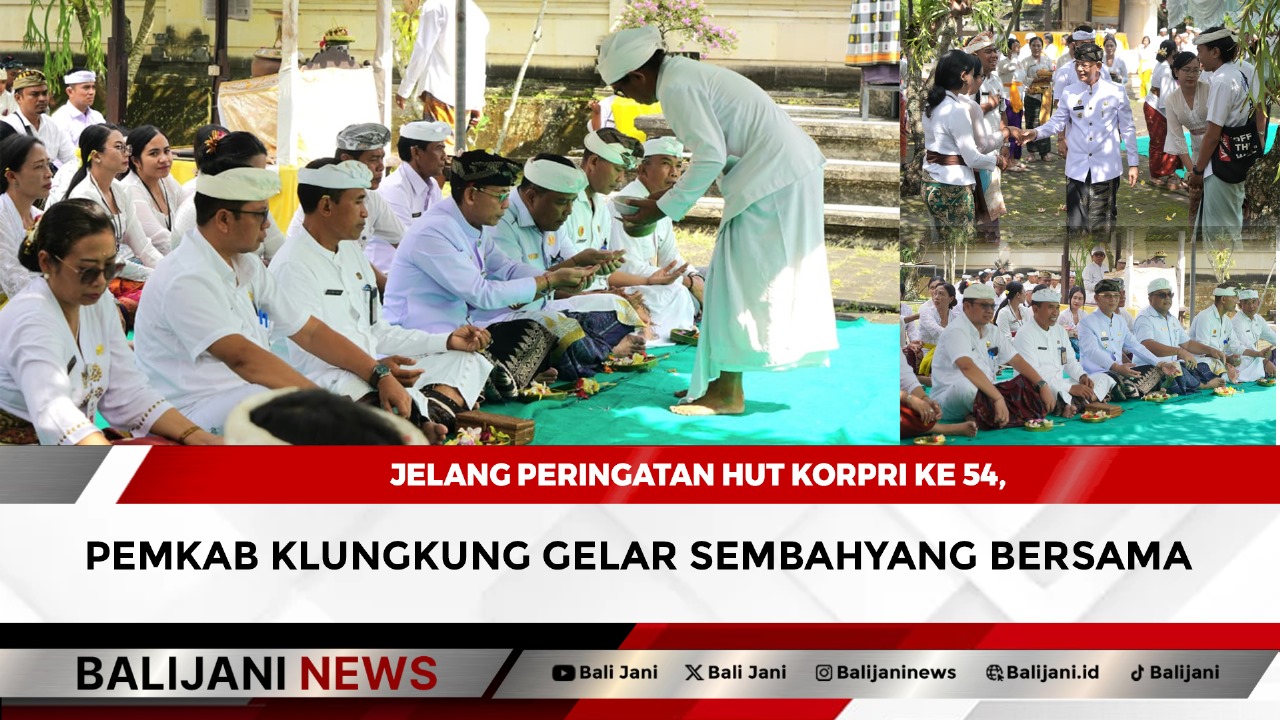 Klungkung, Balijani.id| Bertepatan dengan rahina suci Purnama Kelima, Pemerintah Kabupaten Klungkung menggelar kegiatan persembahyangan bersama di Pura Jagatnatha Klungkung, Rabu (5/11). Kegiatan ini dalam rangka peringatan HUT ke-54 KORPRI dirangkaikan dengan HUT PGRI ke-80, Hari Kesehatan Nasional ke-61 dan HUT Arsada ke-25 Tahun 2025 di Kabupaten Klungkung,