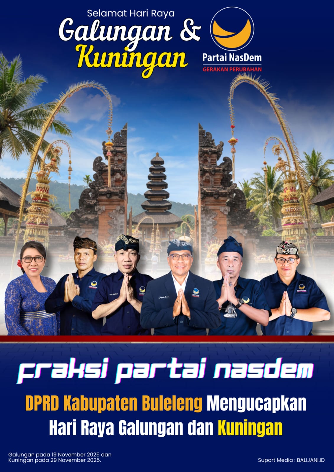 Buleleng, Balijani.id| Fraksi Partai NasDem DPRD Kabupaten Buleleng menyampaikan selamat Hari Raya Galungan dan Kuningan 2025 kepada seluruh masyarakat Bali. Ucapan tersebut menjadi pesan kebersamaan dan ajakan untuk menjaga keseimbangan hidup dalam bingkai Dharma.