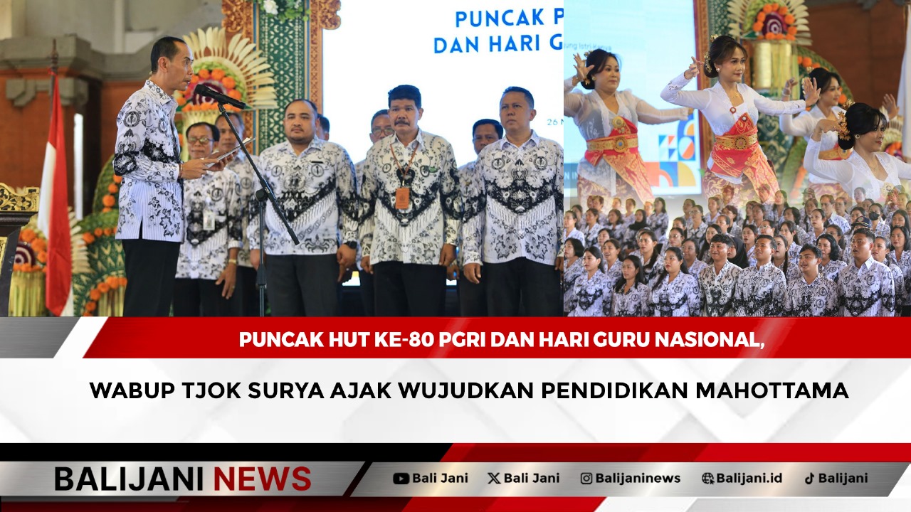 pendidikan yang menyalakan intelektualitas dan keindahan nurani sekaligus wujudkan pendidikan berbasis budaya dan inovasi, yang sejalan dengan semangat Mahottama: berpikir luhur, bertindak kreatif, berjiwa harmoni,” hal Tersebut disampaikan Wakil Bupati Klungkung, Tjokorda Gde Surya Putra mewakili Bupati Klungkung menghadiri Puncak Perayaan HUT Ke-80 PGRI dan Hari Guru Nasional Tahun 2025 di Kabupaten Klungkung. Acara tersebut berlangsung di Balai Budaya Ida Dewa Agung Istri Kanya, Rabu (26/11).