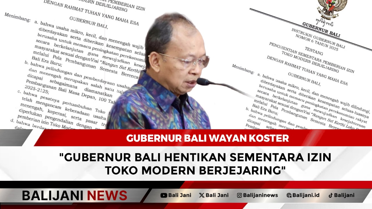Denpasar, Balijani.id| Pemerintah Provinsi Bali menghentikan sementara pemberian izin Toko Modern Berjejaring melalui Instruksi Gubernur Nomor 6 Tahun 2025 yang resmi ditandatangani Gubernur Bali I Wayan Koster pada 2 Desember 2025. Kebijakan ini diambil menyusul meningkatnya kekhawatiran bahwa pertumbuhan toko modern berjejaring telah menekan usaha mikro, kecil, dan menengah (UMKM) serta pasar tradisional di berbagai wilayah.