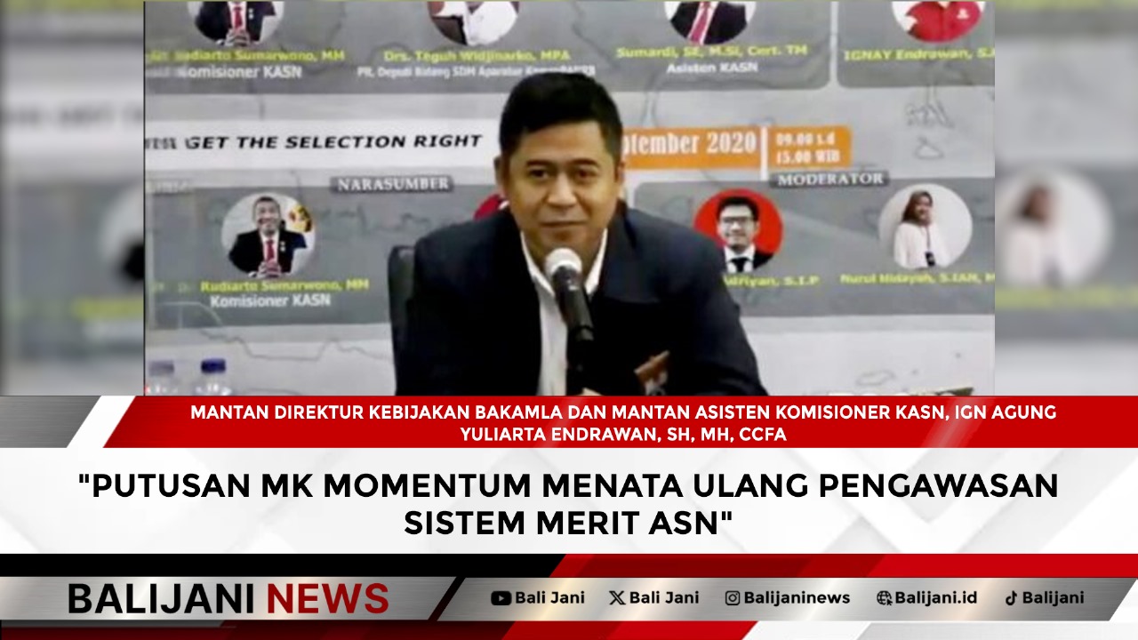 Jakarta, Balijani.id| Mantan Direktur Kebijakan Bakamla dan mantan Asisten Komisioner KASN, IGN Agung Yuliarta Endrawan, SH, MH, CCFA, menilai Putusan Mahkamah Konstitusi Nomor 121/PUU-XXII/2024 sebagai titik balik penting dalam membangun kembali sistem pengawasan merit Aparatur Sipil Negara (ASN).
