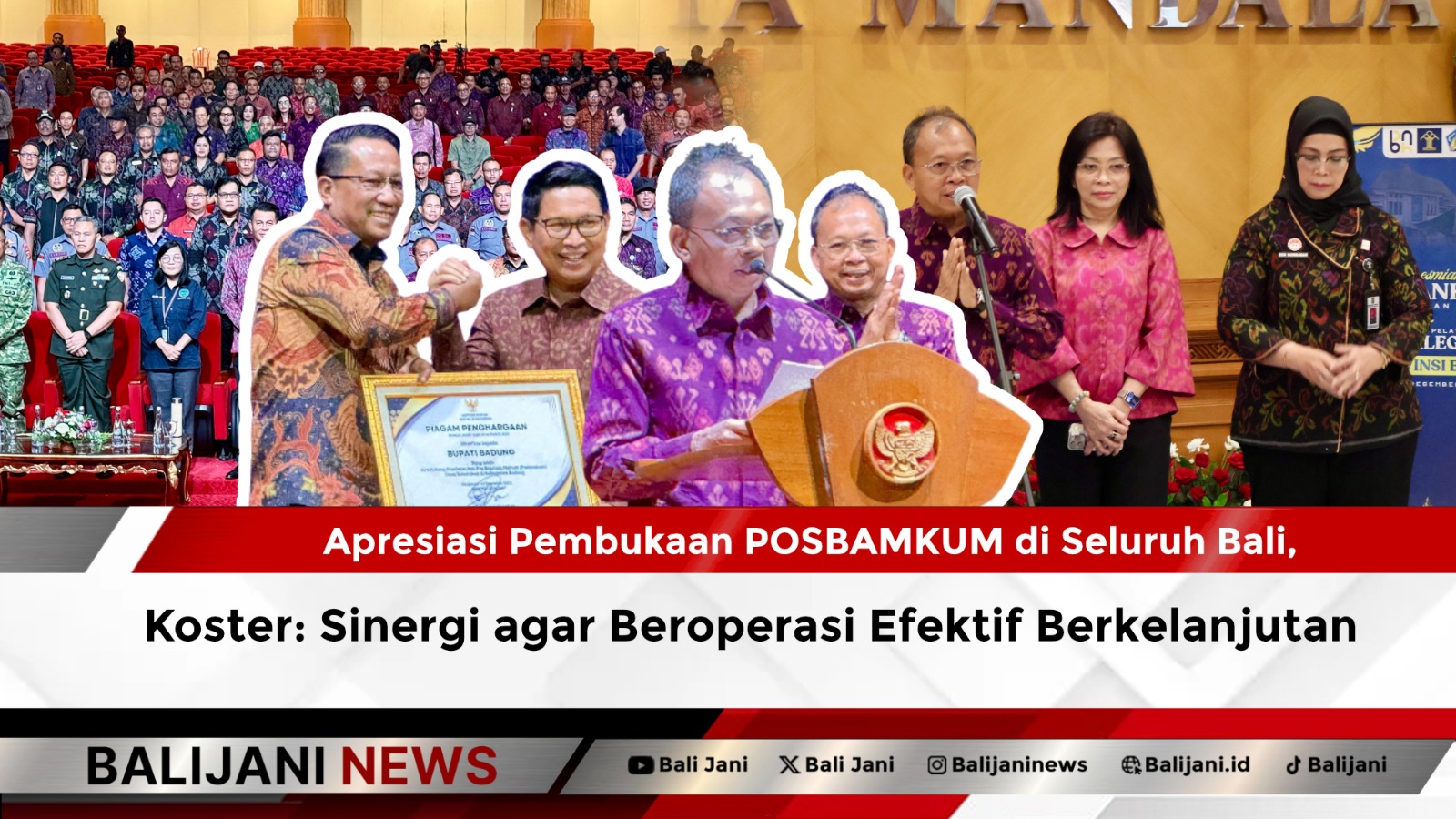 Badung, Balijani.id| Gubernur Bali Wayan Koster bersama dengan Sekjen Kementrian Hukum dan HAM (Kemenkumham) Komjen. Pol. Dr. Nico Afinta, Kepala Badan Pembinaan Hukum Nasional (BPHN) Min Usihen, Kepala Kantor Wilayah (Kakanwil) Kemenkumham Bali Eem Nurmanah mendampingi Menteri Hukum dan HAM RI Supratman Andi Atgas meresmikan Pos Bantuan Hukum (POSBANKUM) dan Pembukaan Pelatihan Paralegal di Provinsi Bali Tahun 2025, bertempat di Balai Budaya Giri Nata Mandala, Puspem Kabupaten Badung, Badung, pada Jumat (12/12).