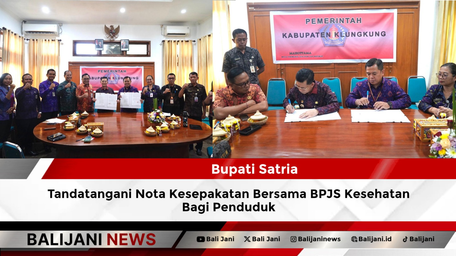 Klungkung, Balijani.id| Pemerintah Kabupaten Klungkung melaksanakan penandatanganan Nota Kesepakatan dengan Badan Penyelenggara Jaminan Sosial (BPJS) Kesehatan Kantor Cabang Klungkung tentang Penyelenggaraan Jaminan Kesehatan Nasional Bagi Penduduk Kabupaten Klungkung Dalam Rangka Universal Health Coverage di ruang rapat Kantor Bupati Klungkung, Selasa (16/12). Penandatanganan tersebut dilakukan Bupati Klungkung, I Made Satria dan dihadiri Sekretaris Daerah Kabupaten Klungkung, Anak Agung Gede Lesmana serta Kepala OPD terkait lainnya dilingkungan Pemkab Klungkung.