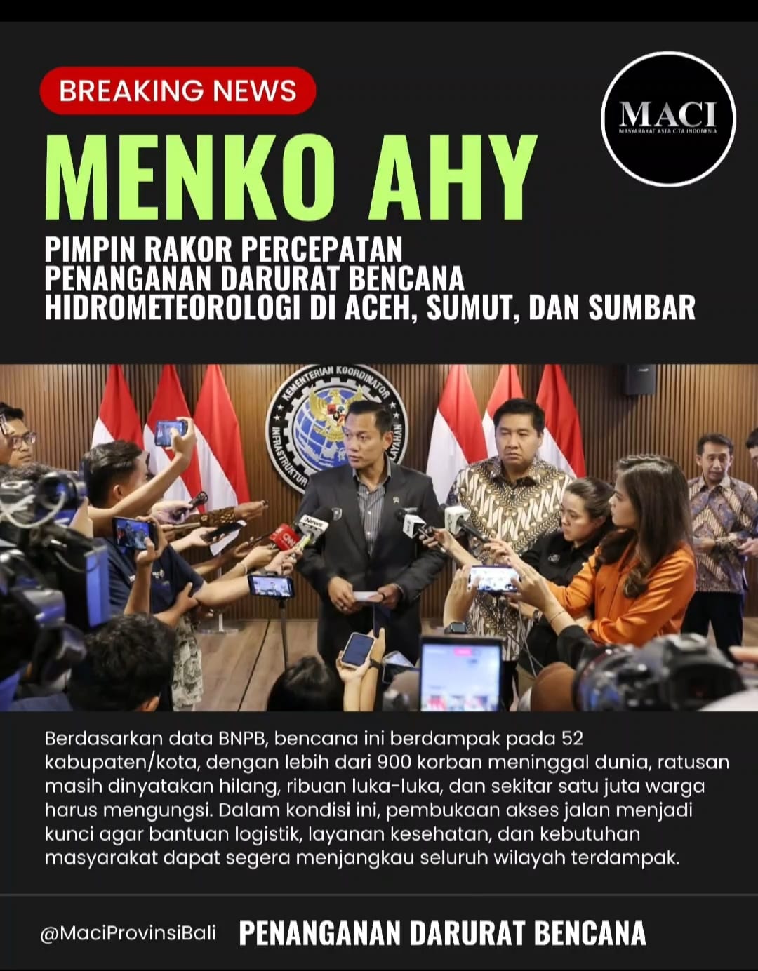 Jakarta, Balijani.id| Kamis, (11/12/2025:), Menko AHY memimpin Rapat Koordinasi lintas kementerian dan lembaga untuk membahas percepatan penanganan darurat serta langkah awal rehabilitasi pascabencana banjir besar dan tanah longsor di Aceh, Sumatera Utara, dan Sumatera Barat. Rapat ini dihadiri oleh Menteri Pekerjaan Umum Bapak @dody_hanggodo dan Menteri Perumahan dan Kawasan Permukiman Bapak @maruararsirait, perwakilan BNPB, serta jajaran @kemenkoinfra.
