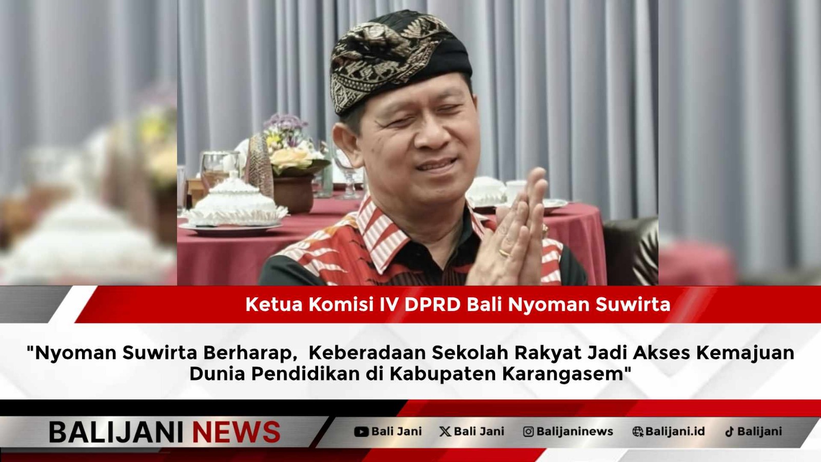 Denpasar, Balijani.id| Ketua Komisi IV DPRD Bali Nyoman Suwirta mendukung adanya pembangunan Sekolah Rakyat di Kabupaten Karangasem sebagai akses pendidikan berkualitas bagi anak-anak dari keluarga kurang mampu.