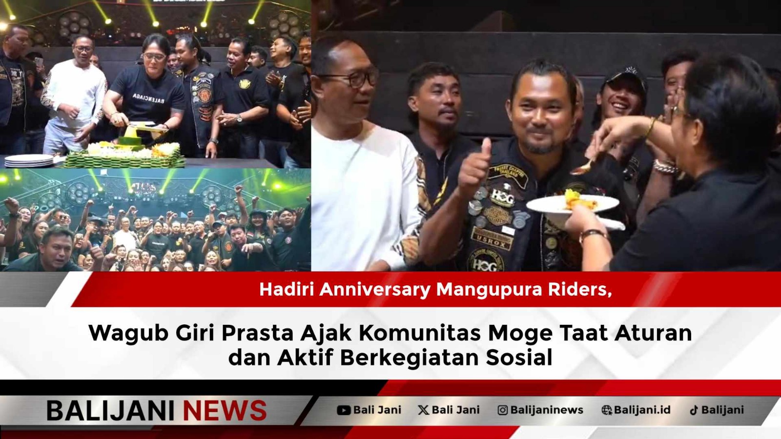 Badung, Balijani.id| Wakil Gubernur Bali, I Nyoman Giri Prasta, menghadiri perayaan Anniversary ke-9 Mangupura Riders yang berlangsung di Atlas Super Club, Badung, Sabtu malam, 20 Desember 2025. Kehadiran Wagub Bali tersebut disambut antusias oleh para riders motor gede (moge) yang tergabung dalam komunitas Mangupura Riders.