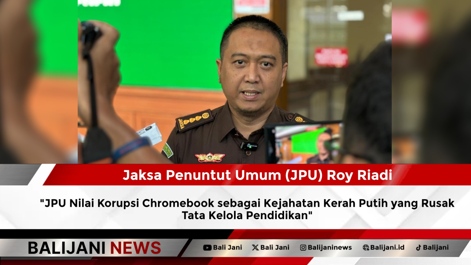 Jakarta, Balijani.id| Jaksa Penuntut Umum (JPU) Roy Riadi menegaskan bahwa perkara dugaan korupsi program Digitalisasi Pendidikan pengadaan Chromebook di Kementerian Pendidikan, Kebudayaan, Riset, dan Teknologi (Kemendikbudristek) merupakan bentuk kejahatan kerah putih yang berdampak serius terhadap sistem pendidikan nasional.