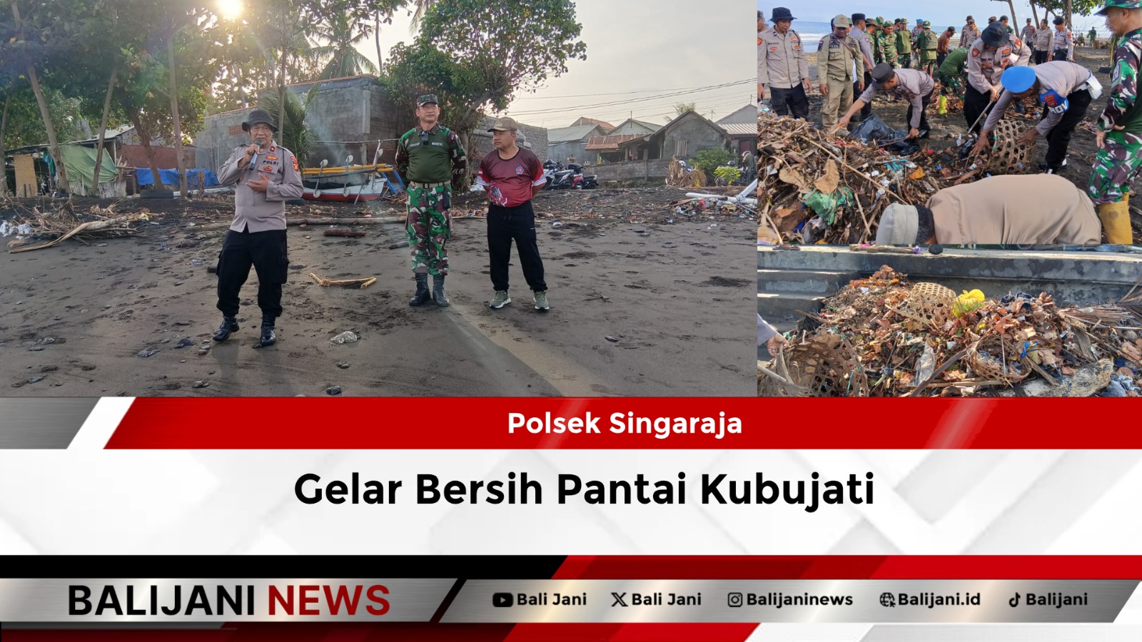 Singaraja, Balijani.id| Aparat kepolisian, TNI, pemerintah kecamatan, dan warga pesisir menggelar aksi bersih sampah plastik di Areal Pantai Kubujati, Kelurahan Banyuning, Kamis (5/2/2026) pagi. Kegiatan ini dipimpin Kapolsek Singaraja, Kompol Gede Juli, S.I.P. Aksi dilakukan untuk mendukung Program Asri menuju Indonesia Emas 2026.