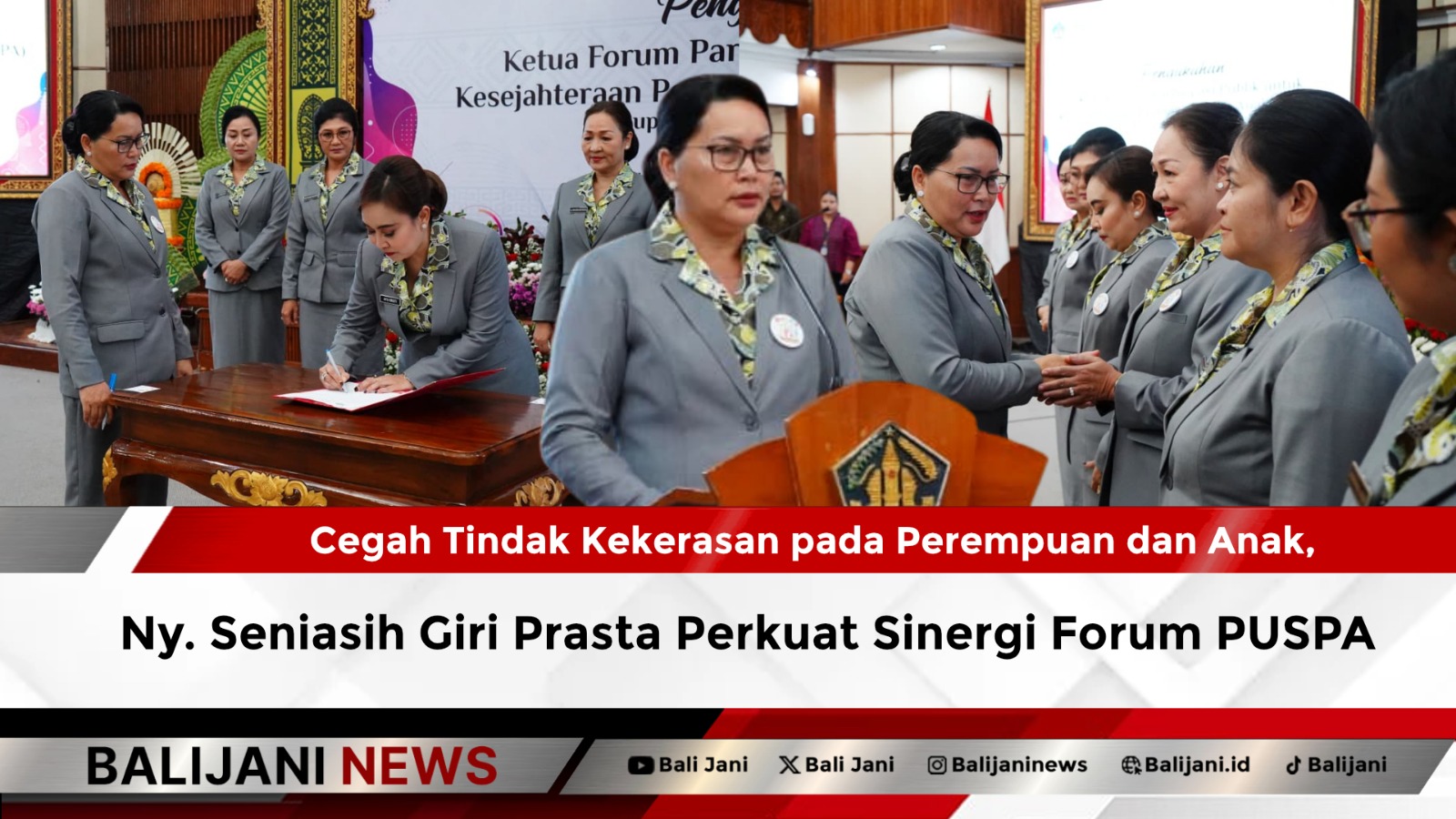 Denpasar, Balijani.id| Ketua Forum Partisipasi Publik untuk Kesejahteraan Perempuan dan Anak (PUSPA) Provinsi Bali Ny. Seniasih Giri Prasta mendorong penguatan komitmen dan sinergi seluruh komponen masyarakat dalam upaya meningkatkan kesejahteraan serta mencegah tindak kekerasan terhadap perempuan dan anak. Hal tersebut disampaikannya dalam sambutan saat mengukuhkan Ketua Forum PUSPA Kabupaten/Kota se-Bali di Ruang Wiswa Sabha Utama, Kantor Gubernur Bali, Jumat (20/2/2026).
