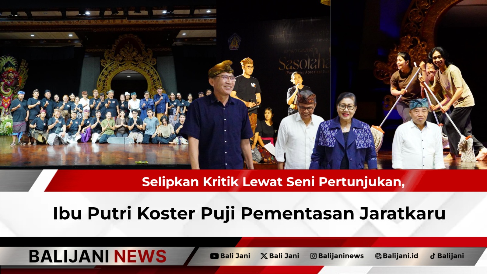 Denpasar, Balijani.id| Ketua TP PKK Provinsi Bali, Ibu Putri Suastini Koster, memuji pementasan Komunitas Wartawan Budaya Bali (Kawiya) yang menampilkan seni teater Jaratkaru: Lampan lan Utang Waras Mekutang dalam rangka memeriahkan Bulan Bahasa Bali VIII Tahun 2026 di Gedung Ksirarnawa, Taman Budaya Provinsi Bali, Senin (23/2/2026).