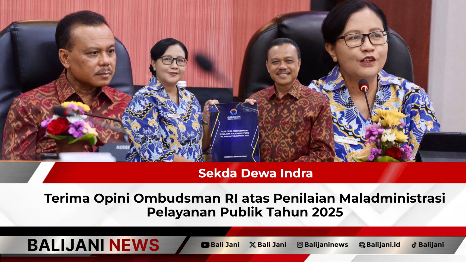 Denpasar, Balijani.id| Sekretaris Daerah Provinsi Bali, Dewa Made Indra, menerima hasil opini Ombudsman RI terkait Penilaian Maladministrasi Pelayanan Publik Tahun 2025 yang diserahkan langsung oleh Kepala Perwakilan Ombudsman RI Provinsi Bali, Ni Nyoman Sri Widianti, di Gedung Wiswa Sabha Pratama, Denpasar, Rabu (25/2). Penilaian ini merupakan bagian dari upaya pengawasan untuk memastikan kualitas pelayanan publik sesuai dengan ketentuan peraturan perundang-undangan.