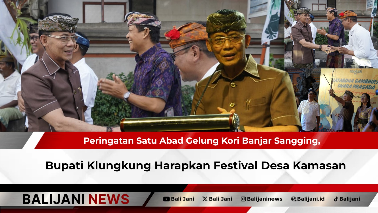 Klungkung, Balijani.id| Bupati Klungkung I Made Satria bersama Ketua TP-PKK Kabupaten Klungkung Ny. Eva Satria dan Wakil Bupati Klungkung Tjokorda Gde Surya Putra menghadiri peringatan Satu Abad Gelung Kori Banjar Sangging, Desa Kamasan, Kecamatan Klungkung, Kabupaten Klungkung, Minggu (8/3). Kegiatan tersebut juga dirangkaikan dengan pelantikan pengurus Sekaa Teruna (ST) Adi Manggala serta perayaan Hari Ulang Tahun ke-46 ST. Adi Manggala Tahun 2026.